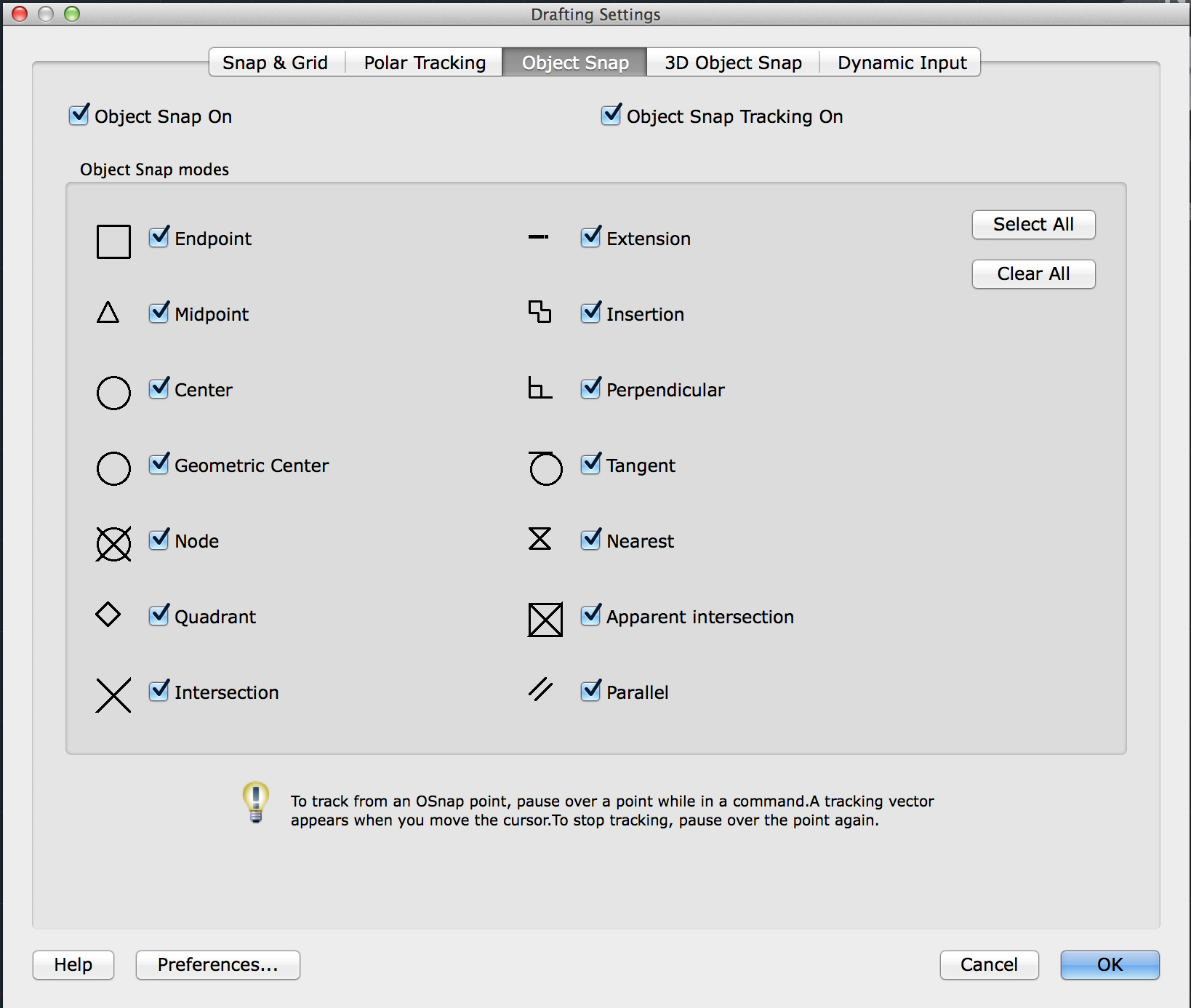 Turns on all running object snap modes.