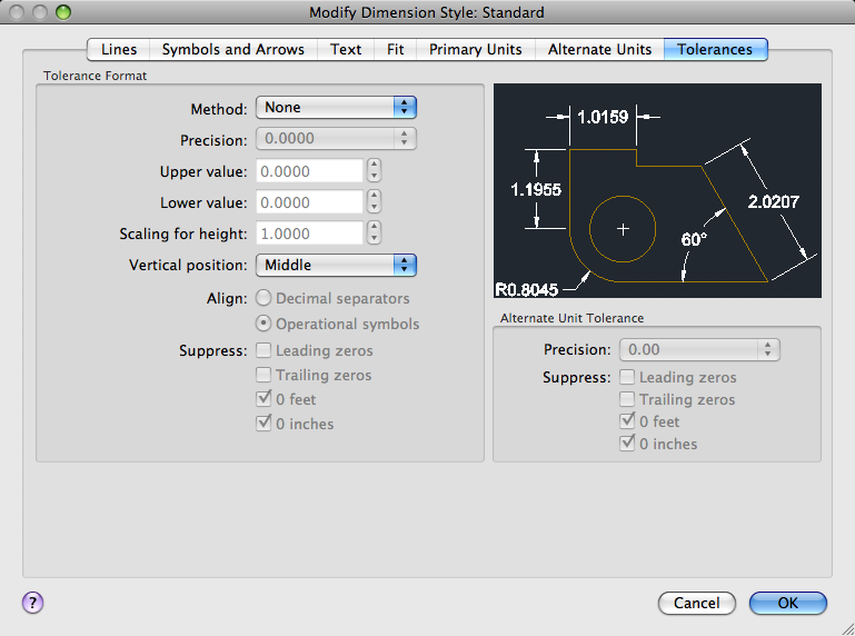 Controls the suppression of leading and trailing zeros and of feet and inches that have a value of zero. (DIMTZIN system variable)