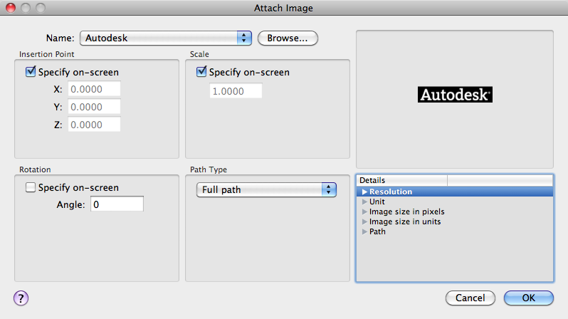 If INSUNITS is set to “unitless” or if the image does not contain resolution information, the scale factor becomes the image width in AutoCAD units. If INSUNITS has a value such as millimeters, centimeters, inches, or feet, and the image has resolution information, the scale factor is applied after the true width of the image in AutoCAD units is determined.