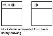 When you insert one drawing file into another drawing, the information from the inserted drawing is saved as a block definition in the block table of the destination drawing. Subsequent references to that block definition can display different position, scale, and rotation settings, as shown in the following illustration.