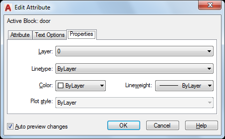 Defines the layer that the attribute is on and the color, lineweight, and linetype for the attribute's line. If the drawing uses plot styles, you can assign a plot style to the attribute using the Properties tab.