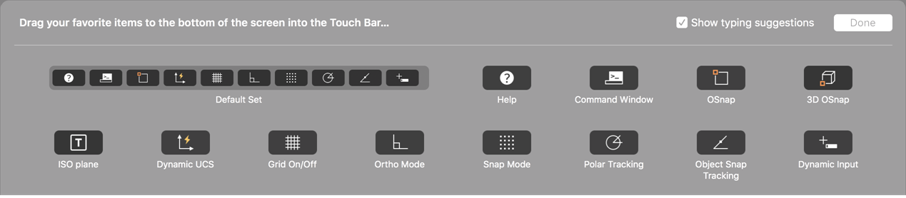 - Select from the list of available commands and drag to the bottom of the screen to drop on to the touch bar.