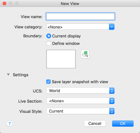 Saves a new, named view from what's displayed in the current viewport, or by defining a rectangular window.
