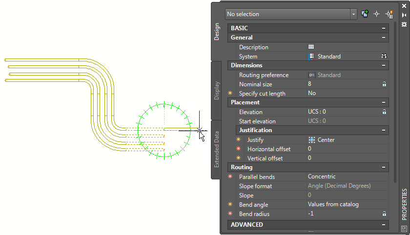 The Properties palette provides 2 options for configuring parallel bends: Concentric and Fixed radius. These options let you specify the type of bend radius for use in a parallel conduit run.