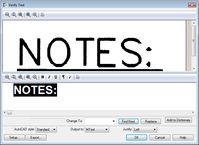Verify Text window displays the word NOTES: in both the View pane (upper pane) and the Edit pane (lower pane). If the word NOTES: is not underlined in the Edit pane, click and drag to select the word and click the underline formatting option on the Edit toolbar. If the recognition engine has inserted any unwanted characters, delete them from the Edit pane.