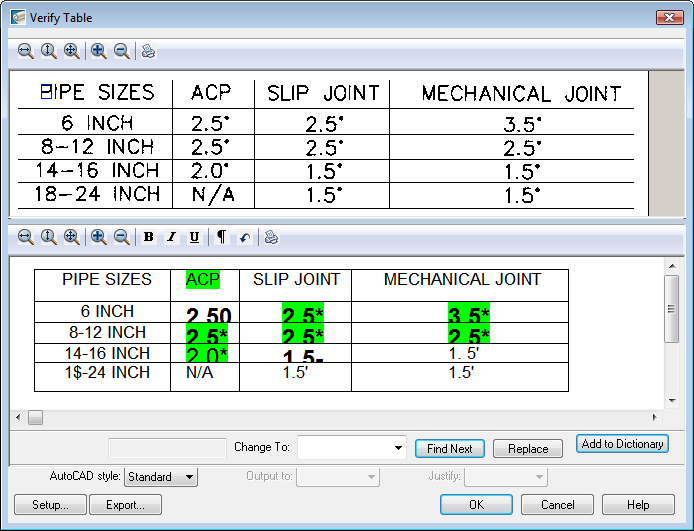 Verify Table window. In this example you would change the $ characters in the first column to the numeral 8 and correct the spacing for the word INCH.