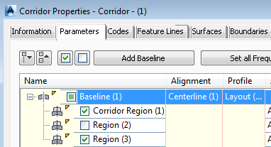 With long corridors or corridor networks, create multiple regions for modeling purposes. Normally, corridor regions are used to mark the use of different assemblies, with a region boundary occurring where the use of one assembly ends and another begins. But you can also add regions without changing assemblies. The value of additional regions is control—you can use the Corridor Properties dialog box to turn off the modeling of regions not required for current operations, as shown in figure 13. This improves the speed of corridor rebuilding.