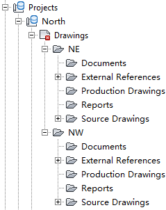 As shown in figure 2, projects NE and NW are within a single Vault project called North. Vault references can link to any object within the North project folder. If you need to extend these references to other projects, create new folders for these projects inside the North project working folder. Replicate the project structure in Vault, using the Autodesk Vault administration tool. You can use subfolders in a project to organize the folders for drawings and documents, but not other project objects, such as the reference links in Prospector or the Vault database files (PointsStatus.mdb, PointsGeometry.mdb, Survey.sdb and Survey.sdx).