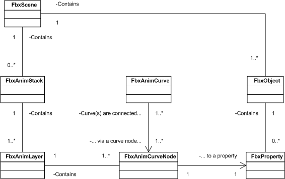 The following UML class diagram shows the interrelationships of classes in a FBX scene.