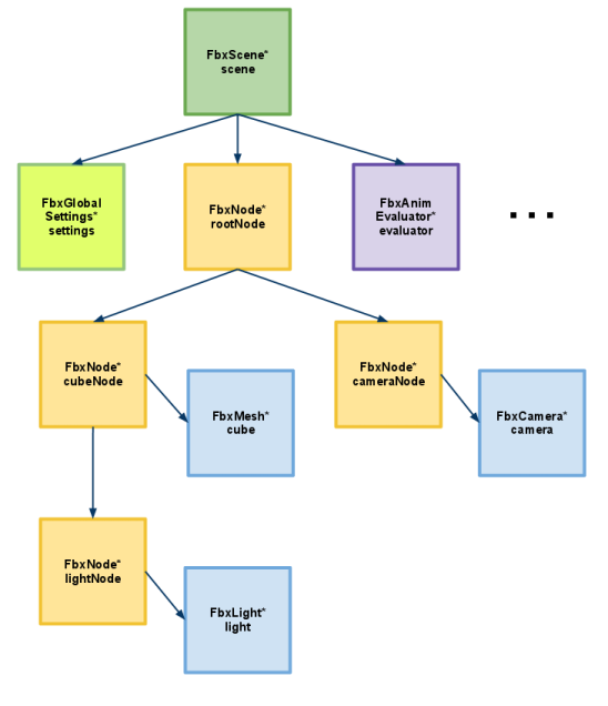 The FBX SDK scene graph is abstracted by the FbxScene class. The scene is organized as a hierarchy of nodes (FbxNode). The root node of the scene is accessed via FbxScene::GetRootNode(). A scene element, for example, a mesh, a light, or a camera is defined by combining a FbxNode with a subclass of FbxNodeAttribute. For more information, see FBX nodes and FBX node attributes.