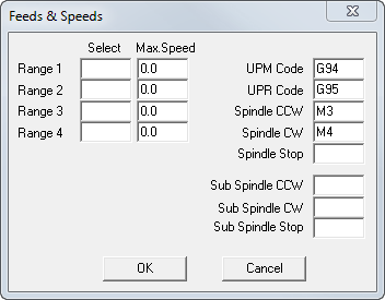 These parameters are used to specify the spindle direction, feed units and the speed range codes that are required by the machine. The Feeds and Speeds dialog is displayed.