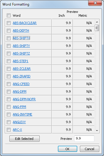 Use the Word Formatting dialog to view and change the output format for reserved-word values. To display the Word Formatting dialog, select the CNC-Info > Word Formatting menu option.