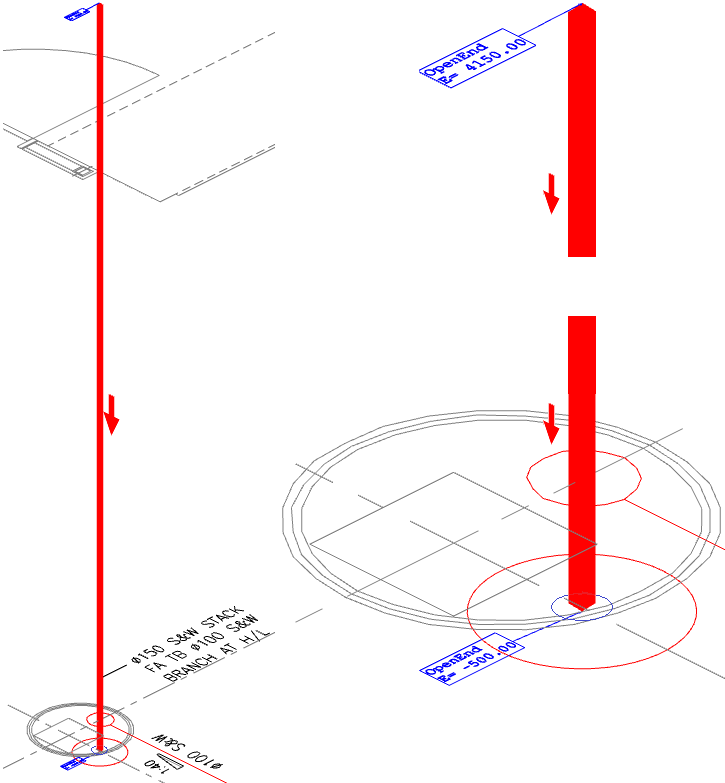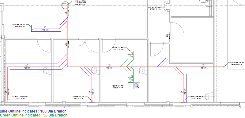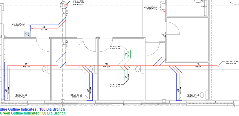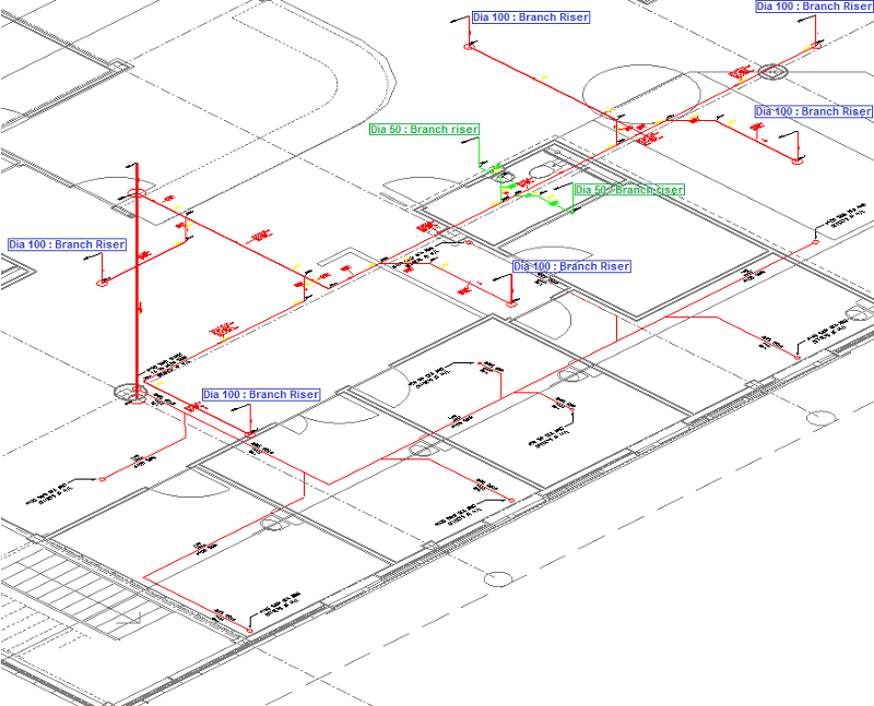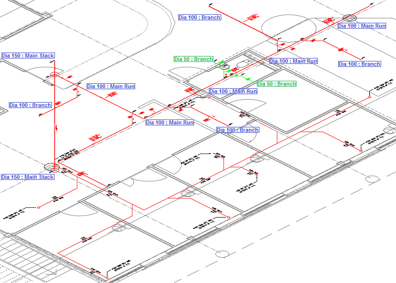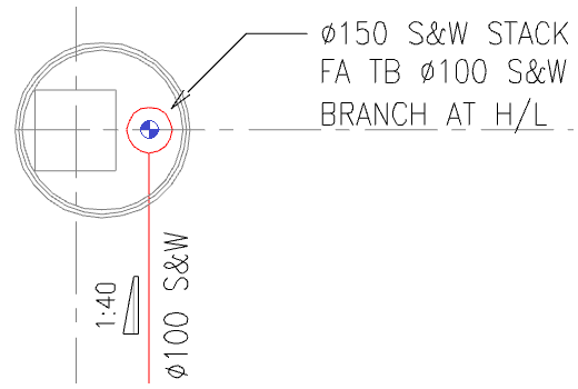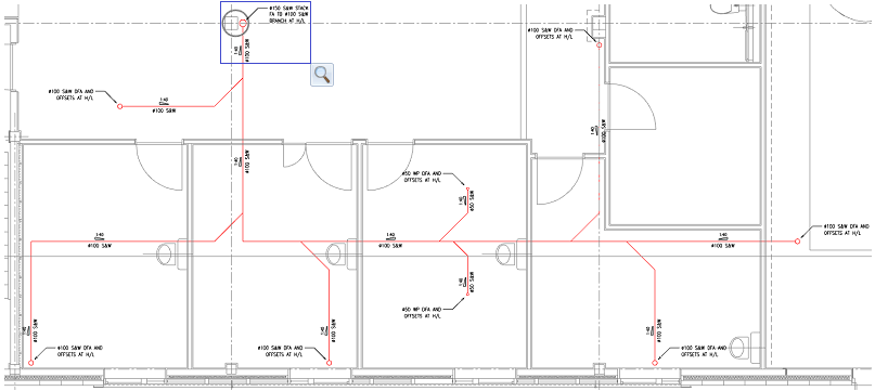 - In the view, zoom into the area of the stack location "Dia 150 S&W Stack FA TB Dia 100 S&W Branch at H/L", as indicated in the upper left area of the building layout.