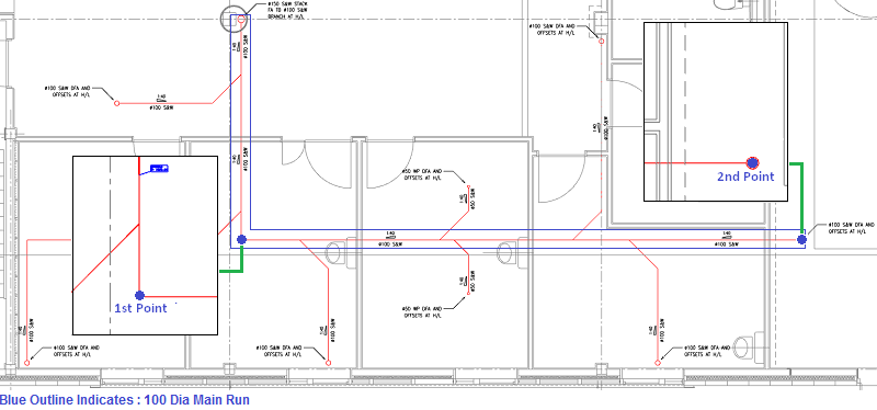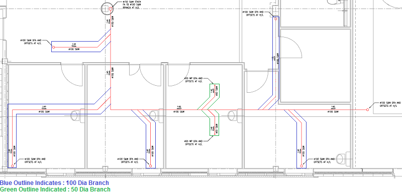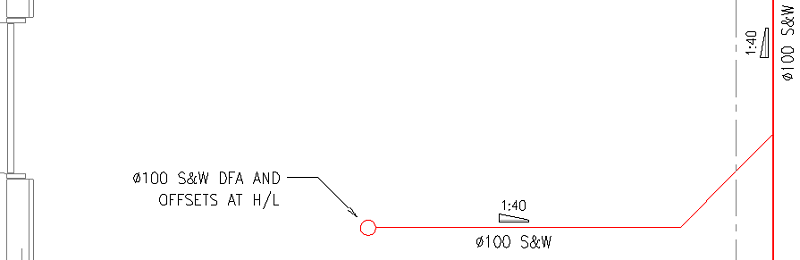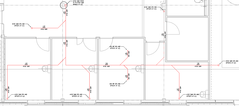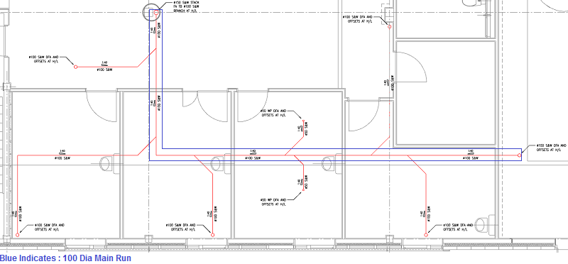 - In the view, zoom into the area of the stack location "Dia 100 S&W DFA AND OFFSETS AT H/L", as indicated in the upper left area of the building layout.