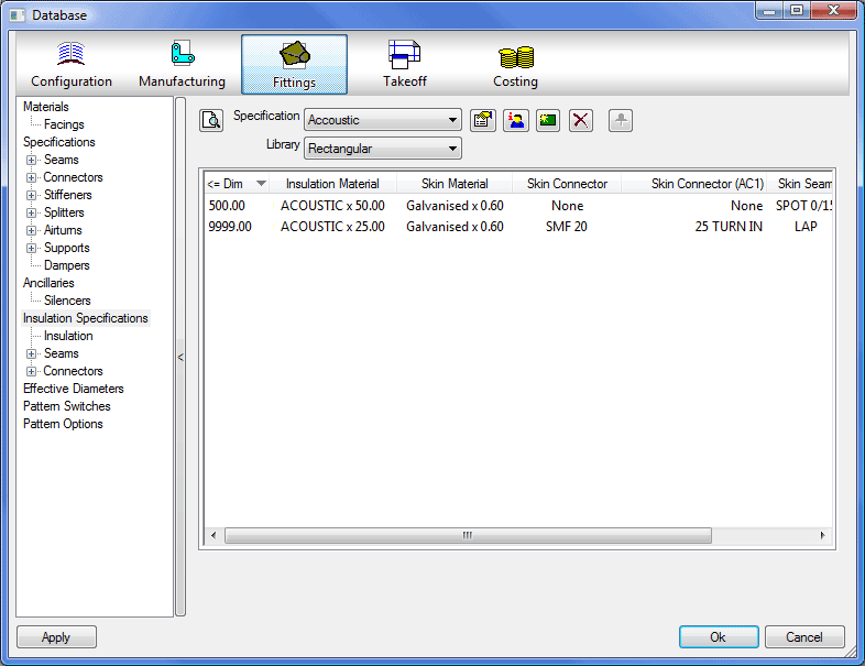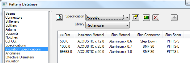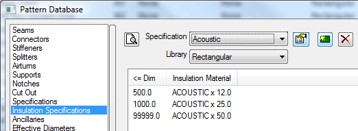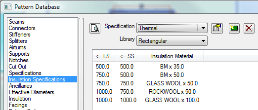 Setting up the specification enables the automatic selection of parameters. Some patterns have the ability to override the specification settings. It is not essential for ductwork users to set up or use specifications. However, when the specification table is correctly set up, adding items to a job takes less time, and is much simpler. Note that before defining the specification, it is necessary to set up the relevant Connector, Seam, and Insulation Material values first.