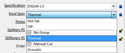 Group: Specifications can be sorted into groups, such as Thermal, Acoustic, etc. To create a new Group, type its name in the Group field. This will then be available for later use in the drop-down list.