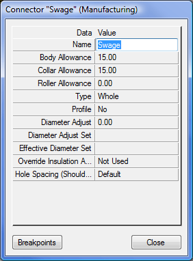 Diameter Adjust Set: A predefined set of parameters that are created in the can be applied to the connector using this field. These parameters are created in the Material Database and are applied to the item when the Material Specific is applied in the Diameter Adjust field.