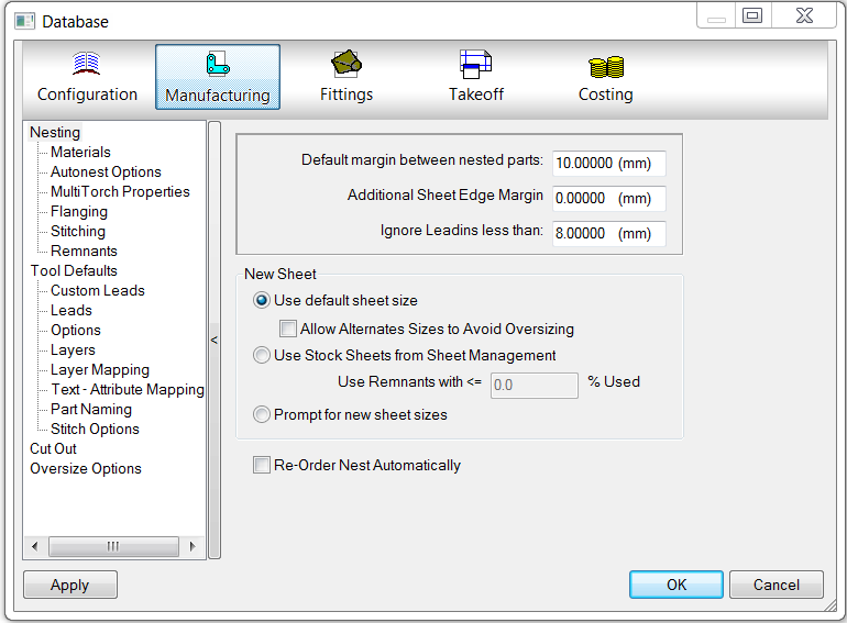 To configure general nesting options for both automatic and manual nesting, from the Database dialog, click Manufacturing