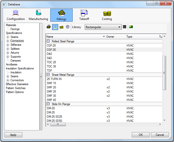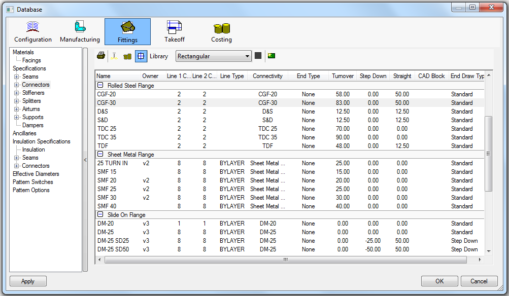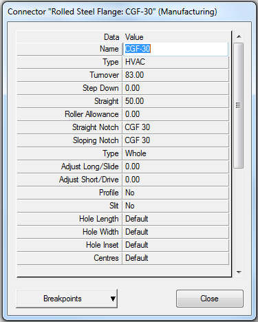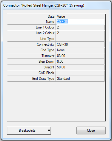 Connector breakpoints are used for setting up the graphical qualities of a connector and the connector end Nodes. They have to be set up for each pattern library, i.e. Rectangular, Round, and Oval. The Database displayed in this help file is used in CAMduct and ESTmep. This is because these programs display all settings for Manufacturing, Costing, and Drawing.