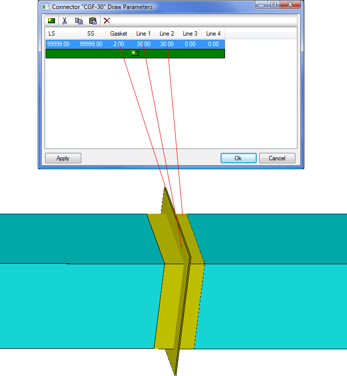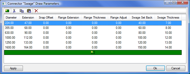 The Table supports Swage, Flange, Coupling and Spigot-Socket type of connectors. The Extension Column defines the length taken up by the connection. When defining Product Dimensions, the Extension dimension can be set to Auto. In which case the values are picked up from the assigned connector. The Table above shows a typical multi size set up for Round Duct Swage Connectors