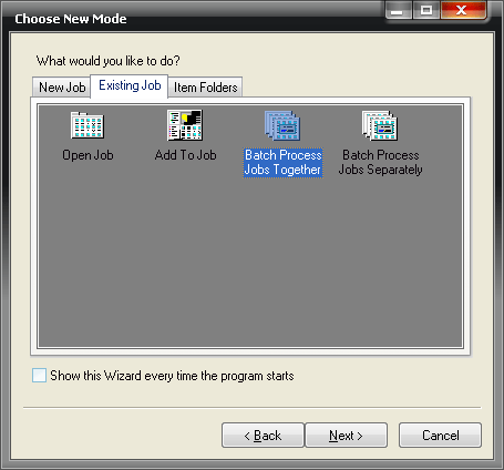 to add jobs to the window on the right side of this dialog. The jobs that are displayed in this window will be batched. The selected jobs are processed in accordance with the actions determined within the Process selected.