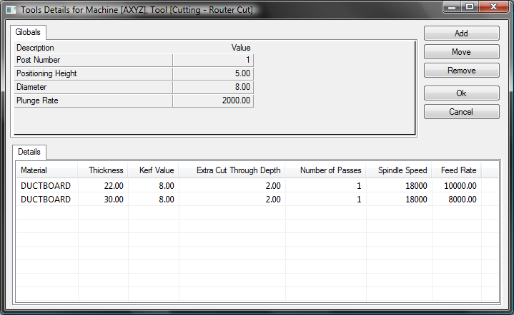 Global Settings: These settings will be applied globally to this tool regardless of the material being cut and the gauge of the material. In the AXYZ machine setup for the cutting tool, this would be setup as follows: