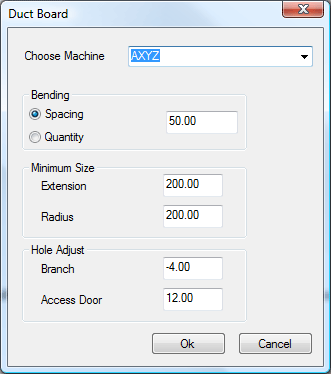 The Duct Board Tab enables the user to customise settings to match the specific Tools and Settings on the required Machine.