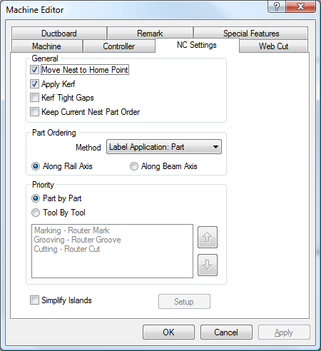 Part Ordering: This option determines the order in which the parts will be cut. If the Keep Current Nest Part Order box is enabled, this option will not be available. The Methods that can be selected are Label Application (i.e. keep the same cutting order as printed with the part labels) , Allow Heat Dissipation (not applicable) and Shortest Path (where the controller will make the decisions based on its own internal settings) . In a router configuration this is kept at Label Application: Part