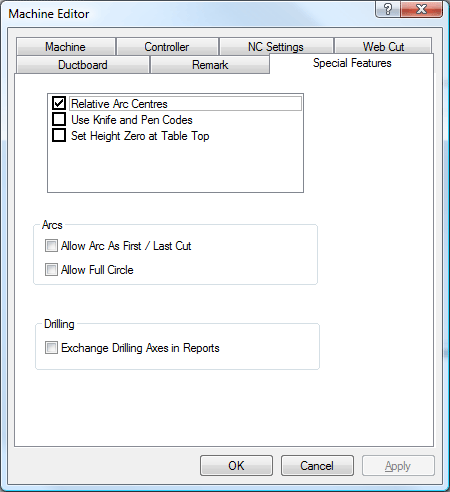 In the Axyz Configuration there are two Special Features that are used and they are the Relative Arc Centers, and the Set Height Zero at Table Top. The Axys Control, while using Absolute Motion, also uses a Relative position for calculating Arcs. This has to be enabled in order for it to work correctly. The Tool position in the Z axis can also use the Table as the Zero point or the top of the Material, this will be dependant on the machine being used the Special Features will be specific to that machine.