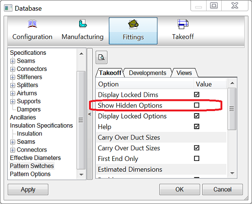 Some fittings use options that are set by the pattern and cannot be changed by a user. Under normal circumstances, these options are not displayed. However, when importing a file or files into the program through an ASCII text file, the true position of pattern options is required, including any hidden ones. An option in the database allows these hidden pattern options to display.