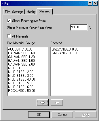 The filter will then be available. It is also possible to configure the filter to shear certain materials and thicknesses.