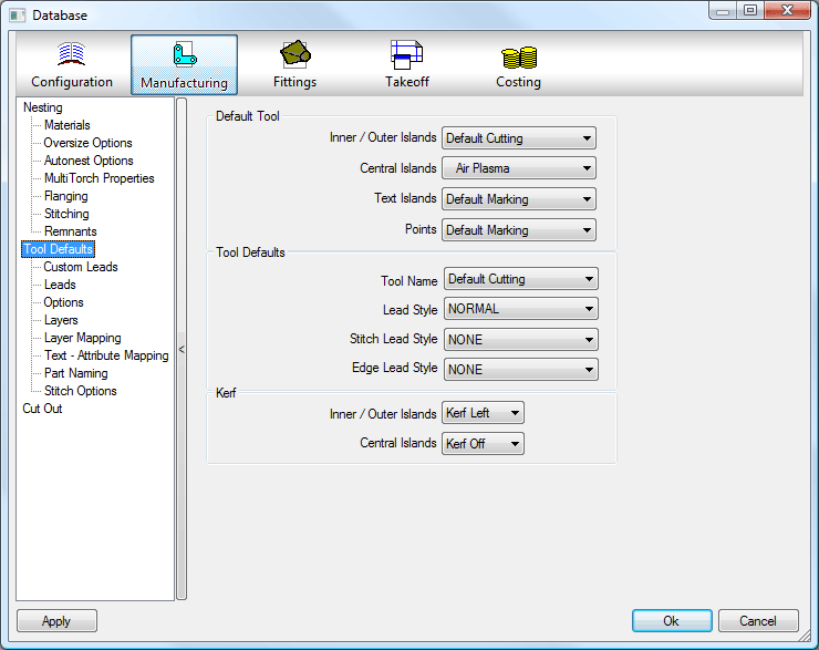 To access the Tool Defaults options, click Database Manufacturing Tool Defaults.