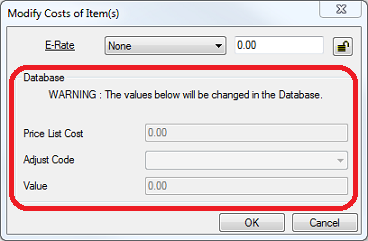 Users that have Edit Database privileges enabled can edit the following settings, located in the Database section of the Modify Costs of Item(s) dialog:
