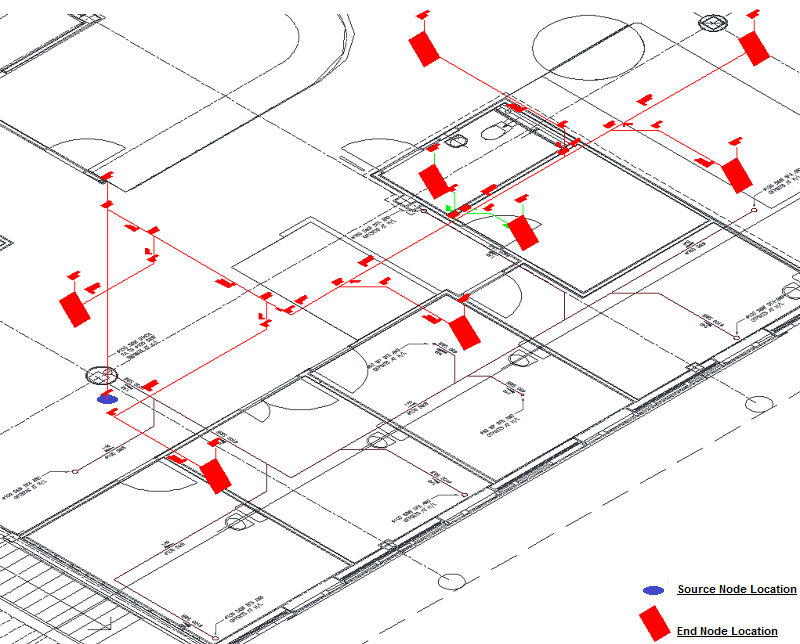Enables a user to automatically select all "End node's" present within the Design Line system, this will automatically determine the longest index run from the pre determined Source Node location . Once determined a singular fitting will maintain the required invert level set on the Elevation in relationship to the U/S of Slab level.