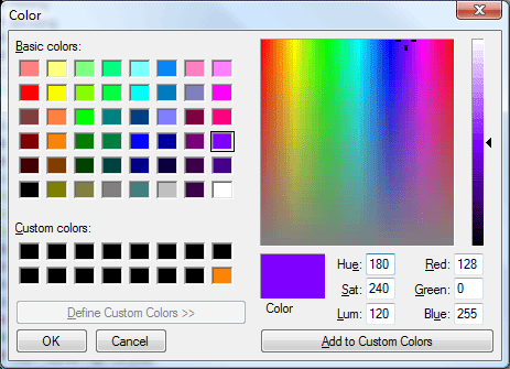 The color pallet is used by clicking on the desired color and then OK. An expanded pallet is available using the Define Custom Colors button. This is a generic windows dialog that displays as many colors as the user has configured in the display settings.