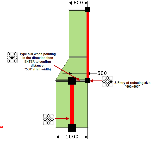 The example below shows a 1000x1000 rectangular duct tapering to 600x600 keeping the right side of the duct "Flat Right". At the time of changing the Fix By position, you can point the Design Line in the required direction, and then type half the width (500) in Line Create mode. Press Enter to confirm the length required, then at the required Flat Right position, select the Fix By from Central to Right, as shown in the diagram below. Together with the reduction in size, using the dimension fields will allow you to draw the line Flat Right. Once Filled in 3D, the alignment should show that the duct is straight on the right side.