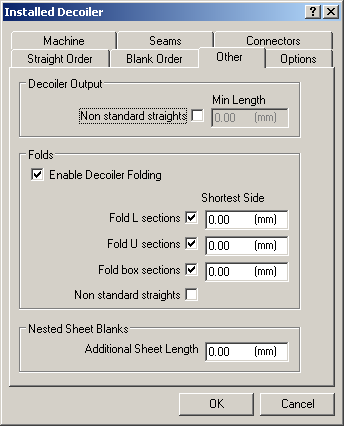 The Folds section controls whether the decoiler is set to do Decoiler Folding, and if so, what the minimum allowed shortest side length is for L sections, U sections, and box sections. Again, non-standard straights can be included in this list.