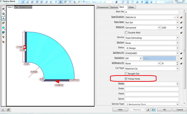 In the Fabrication products, you can configure options that will add fixing holes to certain manufactured parts. This is used primarily by insulated ductwork patterns. To apply these options, you must configure the fixing hole database options in Pattern Switches and Pattern Options. Additionally, since the Fixing Holes option does not display on an item's Takeoff dialog by default, you must customize the Takeoff dialog to include the Fixing Holes option. The steps below describe how to do this.