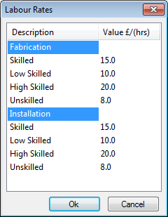 Labor Rates button allows access to all the Labor Rate values in the database. As the quotation would be using an Archive Job (ESJ file), the Labor Rate values can be altered for specific needs. A typical example could be that the job is a supply only in which installation labor can be set to zero for each of the categories under Installation. This would eliminate installation costs amongst all items in the job and provide a total cost minus installation. Alterations to the values of Labor Rates fields only affects the current job, and are instantly represented in the Estimate Summary once confirmed (based on using an ESJ file format).