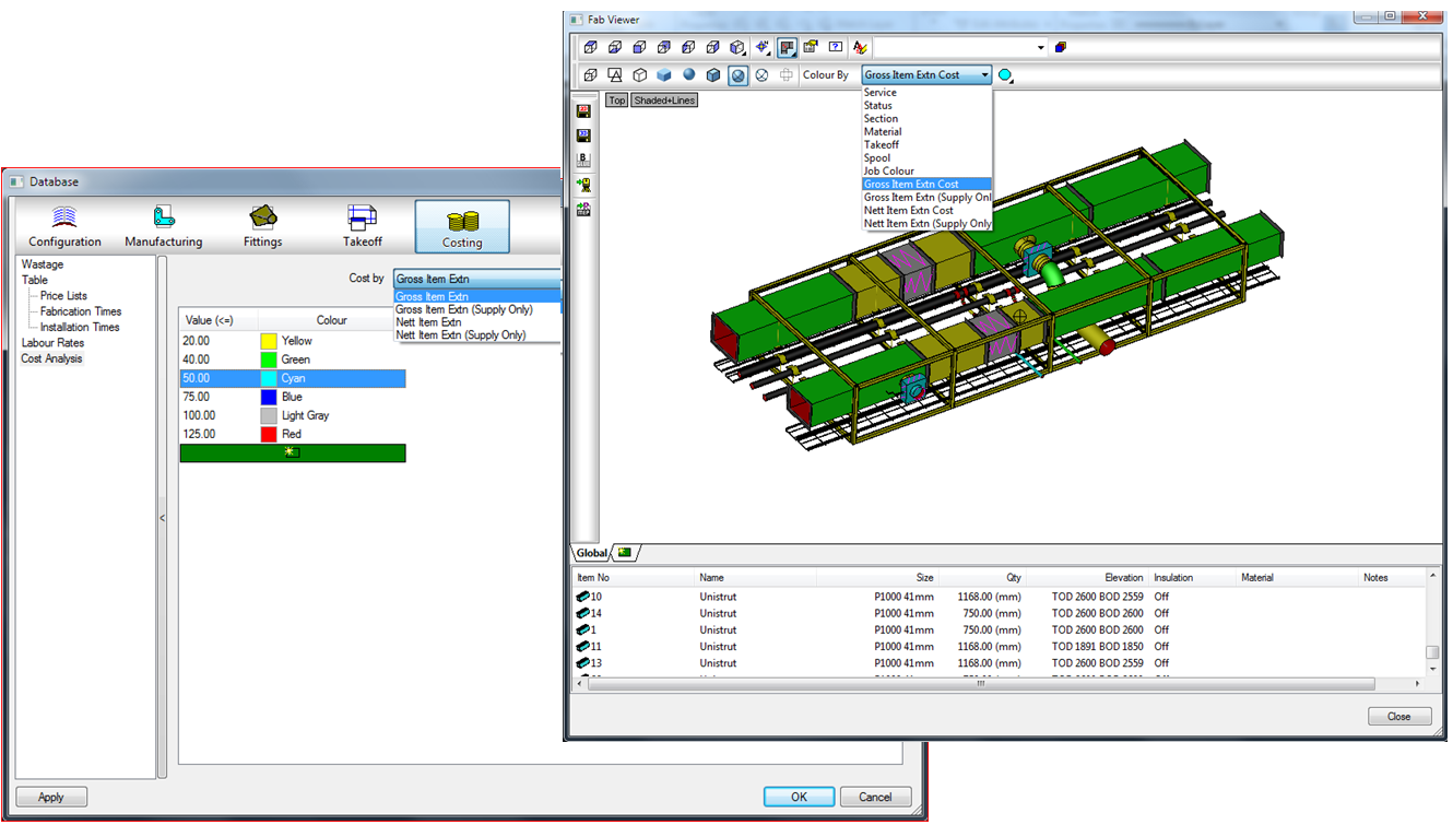 - Once the Cost by categories are configured, use the 3D Viewer (in ESTmep or CAMduct) or the Fab Viewer (in CADmep) to display the items. In the viewer, use the Color By drop-down menu to choose categories to display.