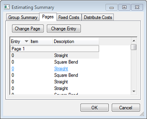 The Pages tab on the Estimating Summary dialog can be used to assign a page number to certain categories or types of parts; for example, straights or square bends, etc. The part categories or types that are assigned a page number are displayed on the assigned page in reports, and on certain Autodesk Fabrication product dialogs that have a page number associated with them.