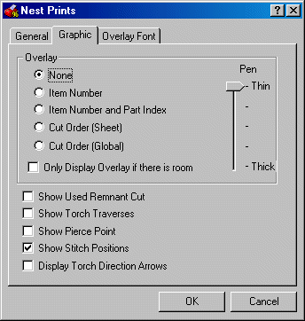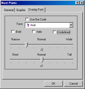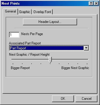 Nests and the Nest Prints dialog displays. This dialog consists of three tabs: General, Graphic and Overlay Font. The options on these tabs are described below.