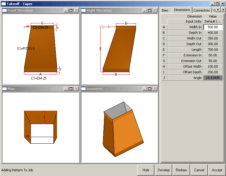 The Taper Pattern can and often does have a double offset. It is important to understand how these offsets are represented visually on the Takeoff dialog. The four views below show the default layout of the taper in the Autodesk Fabrication software, as in a new installation.