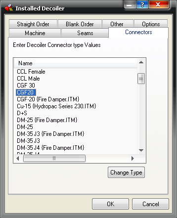 The Connectors tab lets you link the connectors in the Pattern Database to the connector types supported by the decoiler. The options available determine whether a notch will be applied, whether the connector end will berRolled in the Autofold machine, and, if fitted, whether the duct will be placed in the transfer line on the decoiler.