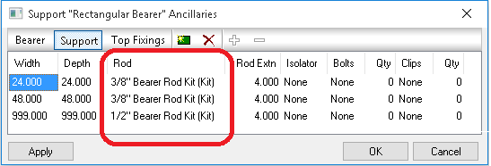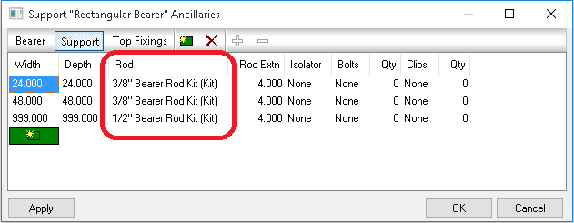 All support ancillaries can be defined in a kit, and a kit can be assigned in the Rod column, as shown above. When a kit is assigned in the Rod column, all columns located to the right of the Rod column are ignored (Rod Extn, Isolator Bolts, Clips, Qty).