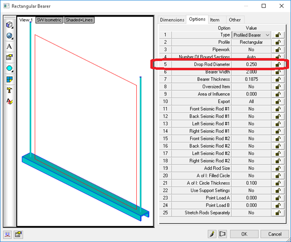 Hanger Pattern Options - In the hanger pattern Options tab, you can use the Drop Rod Diameter field, shown below, to control the hanger drop rod size.