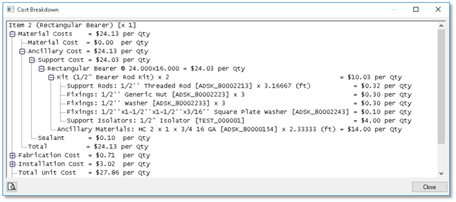 When using this method to specify support rod diameters, costing data is automatically updated when a new ancillary kit is assigned to the hanger. For example, the costing data shown in the sample Cost Breakdown dialog below is updated when a new support rod ancillary kit (with a different diameter) is assigned to the item.