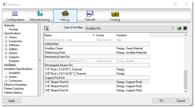 For example, create an ancillary for each type of support rod, clip, fixing (generic nuts, washers), gasket, isolator, and any other ancillary components. For more information, see Ancillaries.