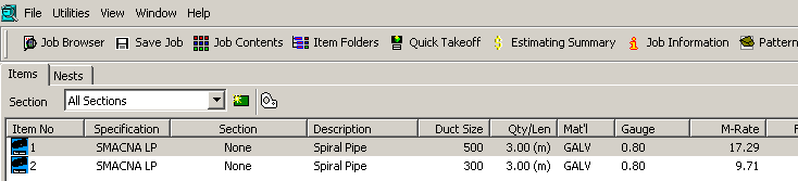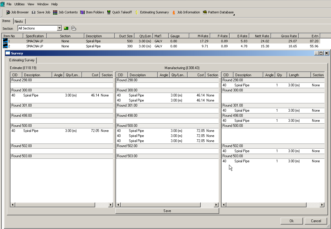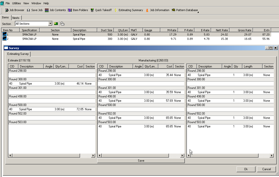 As the effective diameter table has not been adjusted to trap similar sizes, the items in the comparison file are not matched to those in the base Estimate. Hence, the calculated rate for those items do not match up. This can clearly be seen in the Survey dialog image above and Job Contents dialog below.