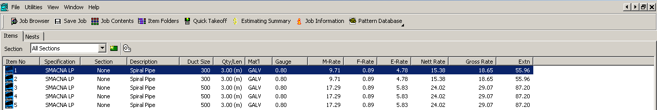 The base estimate contains 2 items of spiral tubes at 300mm and 500mm respectively.